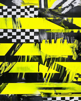 The artist's vision employs a disruptive visual language combining classic racing elements with digital-inspired aesthetics - including checkered flag patterns, hazard stripes, and abstract pixelated forms in a high-contrast palette of black, white, acid green, and metallic gold accents.