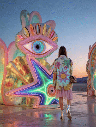Becky's approach liberates creativity from material constraints, allowing her to explore iridescent and glittering surfaces without environmental impact while maintaining her commitment to ethical production. Her vegan, carbon-neutral print collections and commercial work for forward-thinking brands demonstrate how AI-driven art can merge imaginative world-building with conscious consumption.
